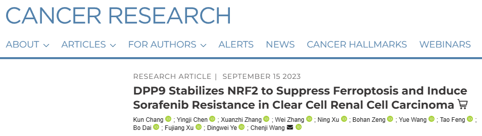 2023年9月15日,耽美漫画 王陈继团队、耽美漫画 附属肿瘤医院叶定伟、戴波团队和西南医科大学附属医院徐富江团队合作在Cancer Research在线发表了题为DPP9 Stabilizes NRF2 to Suppress Ferroptosis and Induce Sorafenib Resistance in Clear Cell Renal Cell Carcinoma的研究论文。该研究发现揭示DPP9通过竞争性结合KEAP1,稳定NRF2蛋白水平,激活氧化应激信号,抑制细胞铁死亡,从而诱导了ccRCC靶向治疗耐药。