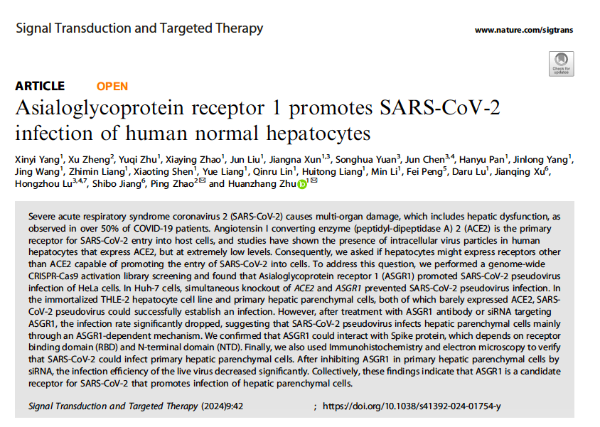 近日,耽美漫画 朱焕章课题组与海军军医大学赵平课题组、耽美漫画 义乌研究院杨辛毅课题组合作,在Signal Transduction and Targeted Therapy杂志上以长文的形式发表了题为“Asialoglycoprotein receptor 1 promotes SARS-CoV-2infection of human normal hepatocytes”的研究论文,该研究首次证实,ASGR1是新冠病毒感染正常肝实质细胞的潜在受体,并且这一过程是不依赖于ACE2的。