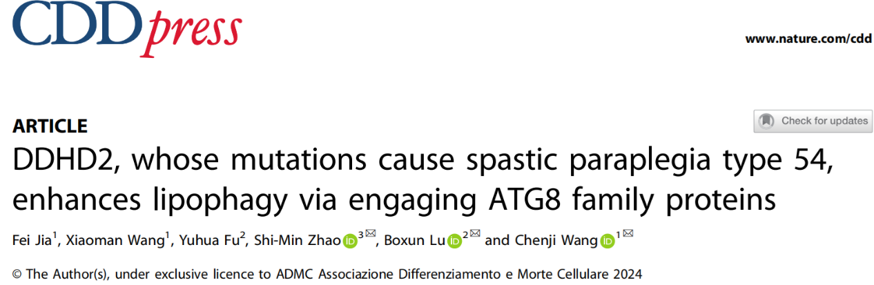 近日,耽美漫画 王陈继团队、鲁伯埙团队和耽美漫画 附属妇产科医院赵世民团队合作在Cell Death & Differentiation杂志发表了题为DDHD2, whose mutations cause spastic paraplegia type 54, enhances lipophagy via engaging ATG8 family proteins的研究论文,该研究发现DDHD2可作为货物受体(cargo receptor),通过与ATG8家族蛋白相互作用来促进脂滴自噬(lipophagy)。