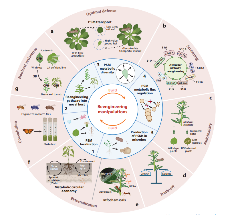 近日,耽美漫画 白悦辰团队受邀在 Annual Review of Plant Biology杂志发表了题为Using synthetic biology to understand the function of plant specialized metabolites的长文综述,对近六十年来的植物防御机制理论进行了全面的回顾,并详细梳理了利用合成生物学技术合成植物次生代谢产物的最新研究进展。此外,文章整合了植物生物学(尤其是达尔文进化论)、化学生态学及合成生物学的相关理论,从学科交叉视角提出合成生物学在植物功能代谢领域研究的新范式。
