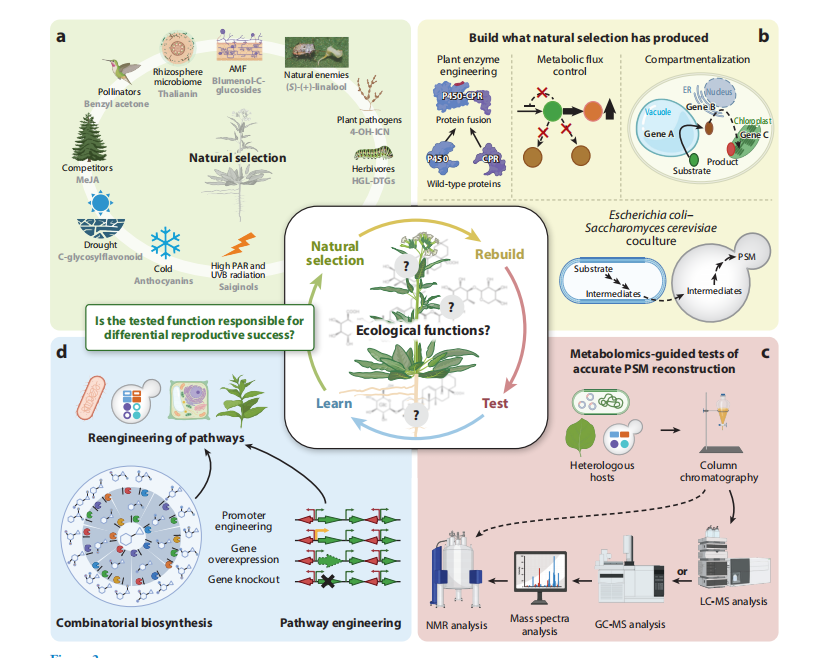 本文回顾了植物次生代谢物(PSMs)功能研究领域的发展历程,提出了一个包含自然选择、重构、测试和学习四个阶段的迭代循环流程,用于深入探索PSMs的功能(见图2)。在这个循环中,自然选择充当了设计师的角色,指引我们识别出那些与特定生态环境中的生存能力相关的PSMs及其遗传变异。接下来,通过整合生物信息学、代谢组学、蛋白质工程和合成生物学等跨学科的先进技术和方法,我们能够执行PSMs的合成、定量分析、遗传改造以及PSMs途径的异源表达等关键步骤。通过将这些改造植物重新引入自然环境并进行详细的自然历史观察,我们能够测试与它们功能相关的众多假说,从而进一步深入理解PSMs的作用机制。