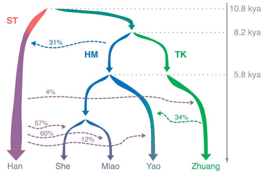 此外,该研究揭示了苗瑶人群与侗傣人群、汉族人群的紧密亲缘关系。其中,苗瑶人群与侗傣人群共享同一种主要遗传祖源,这种遗传成分也在南方汉族人群中高频存在,在北方汉族人群中却较为罕见。结合共享遗传漂变分析的结果推断,汉族人口扩张前与苗瑶祖先人群有过一定程度的基因交流。通过估计人群遗传分化时间,结果表明苗瑶人群与侗傣人群的共同祖先可追溯至8200年前,与汉族人群的共同祖先可追溯至10800年前。
