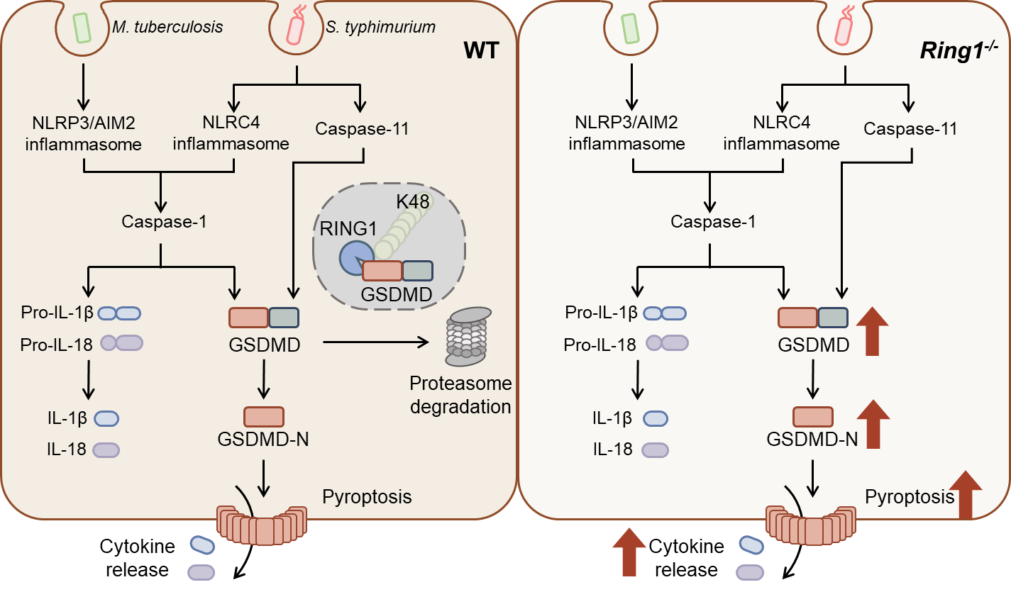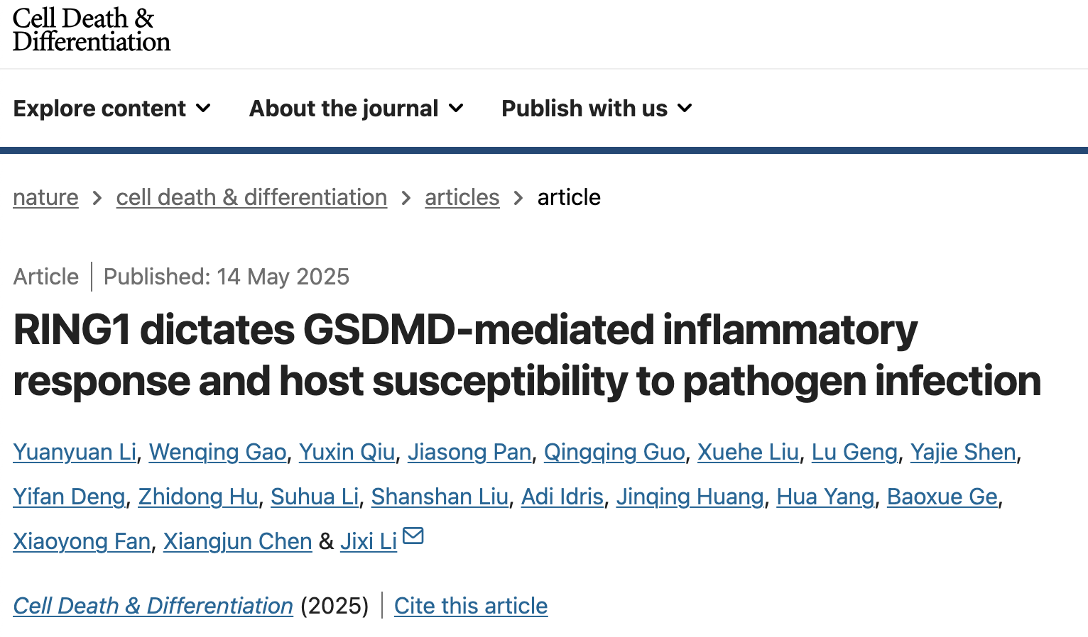 细胞焦亡(pyroptosis)是机体应对病原体感染的重要炎症性死亡方式,但其过度激活可能导致败血症等致命性炎症损伤。RING1作为多梳抑制复合物PRC1的核心组分,在表观遗传调控中发挥关键作用,但在炎症与感染中的功能尚不明确。2025年5月14日,耽美漫画 李继喜教授团队在《Cell Death & Differentiation 》杂志发表了题为“RING1 dictates GSDMD-mediated inflammatory response and host susceptibility to pathogen infection”的研究论文。该研究首次揭示RING1通过泛素化降解焦亡关键蛋白GSDMD,调控宿主对病原体感染的炎症反应。