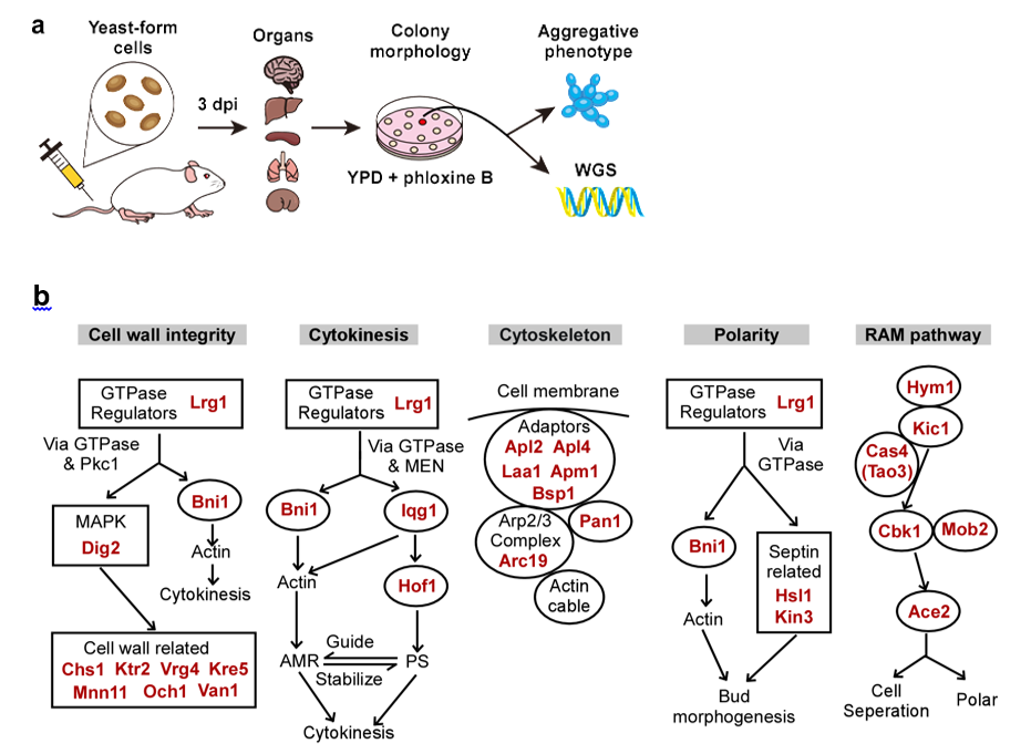 a. 耳念珠菌小鼠系统感染及聚集态细胞的分离和基因组测序;b. 聚集态细胞中细胞壁完整性、胞质分裂、细胞骨架组装、细胞极性和RAM信号通路相关基因的突变。