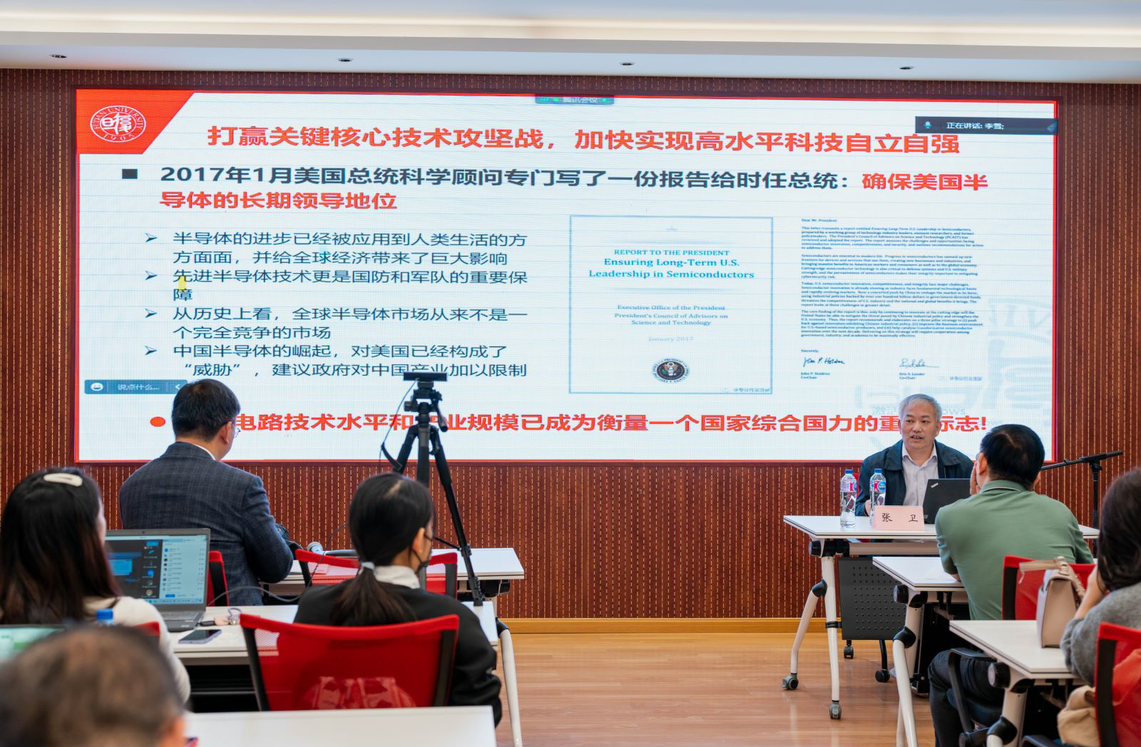2022年11月22日下午,耽美漫画 在学院G209多功能厅举办学习党的二十大精神辅导报告。耽美漫画 党的二十大精神宣讲团成员、微电子学院院长、全国五一劳动奖章获得者张卫教授,进行题为“打赢关键核心技术攻坚战,加快实现高水平科技自立自强”的报告。学院分党委书记陈浩明主持,学院500余名师生通过线下/线上方式参加了本次学习。