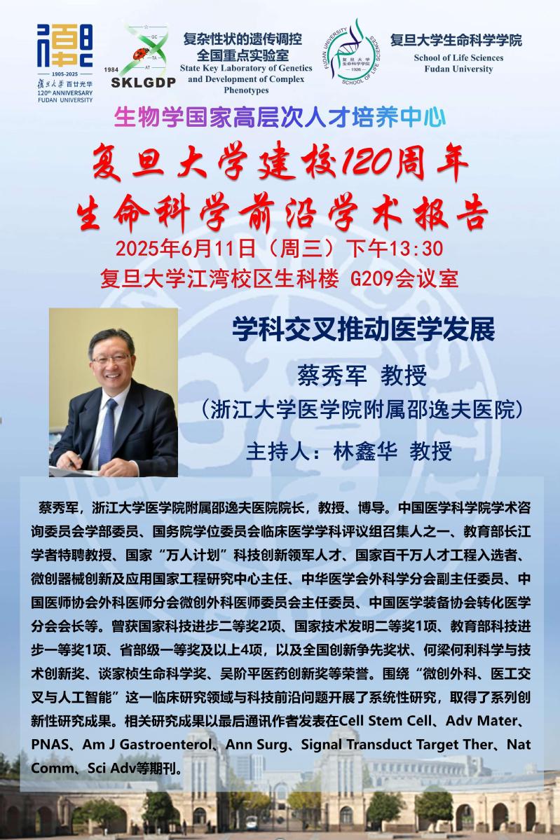 生命科学前沿学术报告-2025-06-11(周三) 13:30,蔡秀军 教授(浙江大学医学院附属邵逸夫医院)