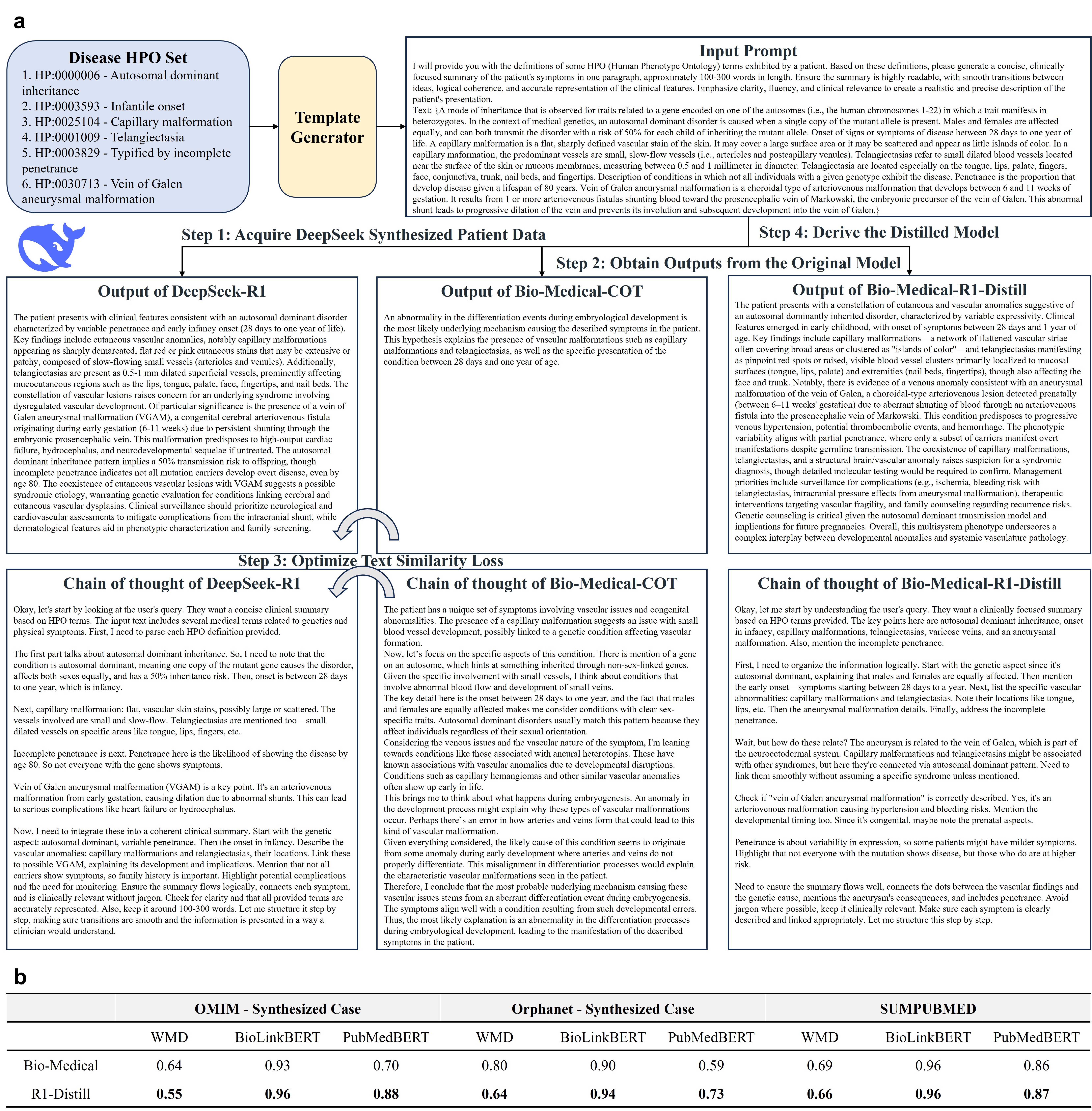 Summarizer:基于蒸馏训练的Bio-Medical-3B-CoT模型,输入HPO术语,输出高质量、以患者为中心的临床摘要,提升症状的可解释性。