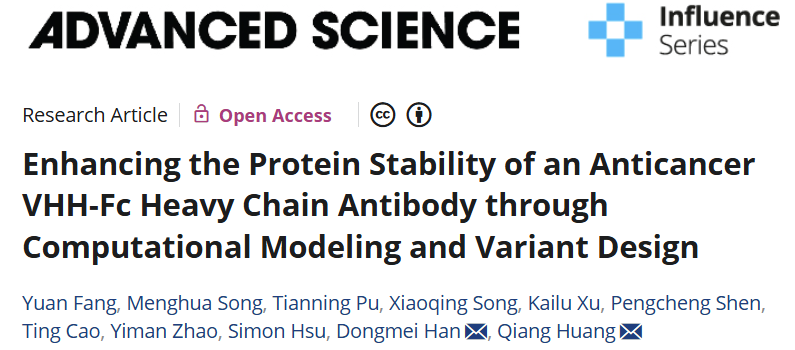 Y. Fang, M. Song, T. Pu, X. Song, K. Xu, P. Shen, T. Cao, Y. Zhao, S. Hsu, D. Han*, Q. Huang*. Enhancing the Protein Stability of an Anticancer VHH-Fc Heavy Chain Antibody through Computational Modeling and Variant Design. Advanced Science. 2025. //doi.org/10.1002/advs.202500004