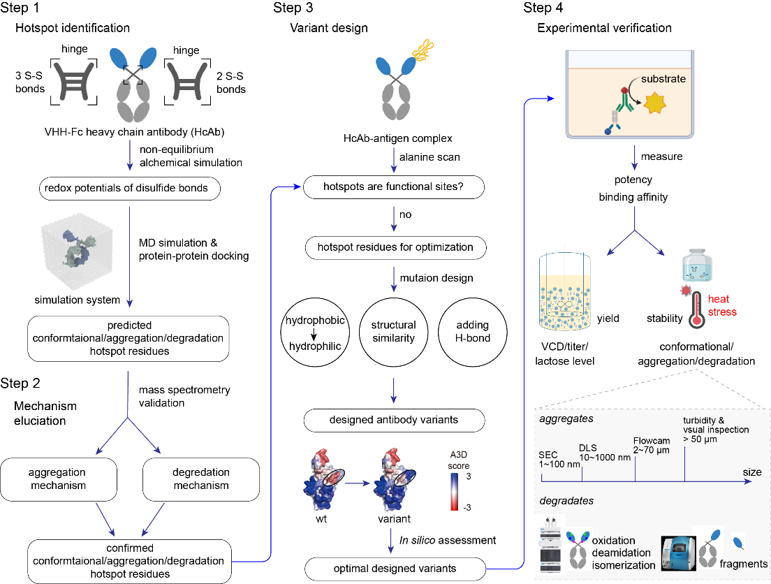 图1. VHH-Fc融合抗体的蛋白质稳定性评估与变体设计流程 (源于Advanced Science).