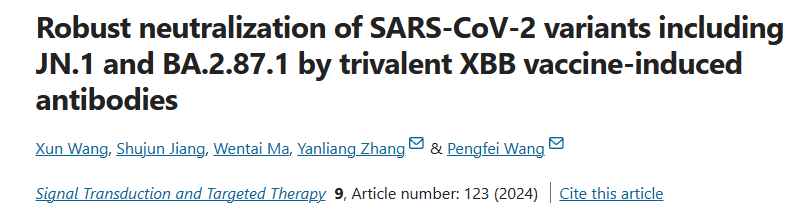 2024年5月9日,耽美漫画 王鹏飞联合南京市中医院于国际权威杂志Signal Transduction and Targeted Therapy在线发表题为“Robust neutralization of SARS-CoV-2 variants including JN.1 and BA.2.87.1 by trivalent XBB vaccine-induced antibodies”的论文,研究显示威斯克3价XBB疫苗针对多种新冠变异株比XBB突破感染者诱导了更强的中和抗体反应,可有效对抗广泛的新冠病毒变异株。