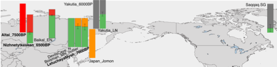 图2. 古东北亚人群祖源成分(绿色)跨大陆分布图