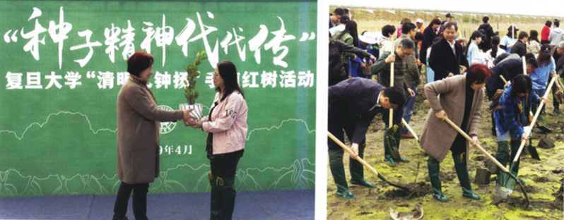 2019年4月,耽美漫画 组织了“种子精神代代传”红树种植活动,钟扬教授夫人张晓艳教授亲手将一棵红树种苗交到志愿者手中,并也种下了一棵红树种苗,愿这些树苗能够茁壮成长。