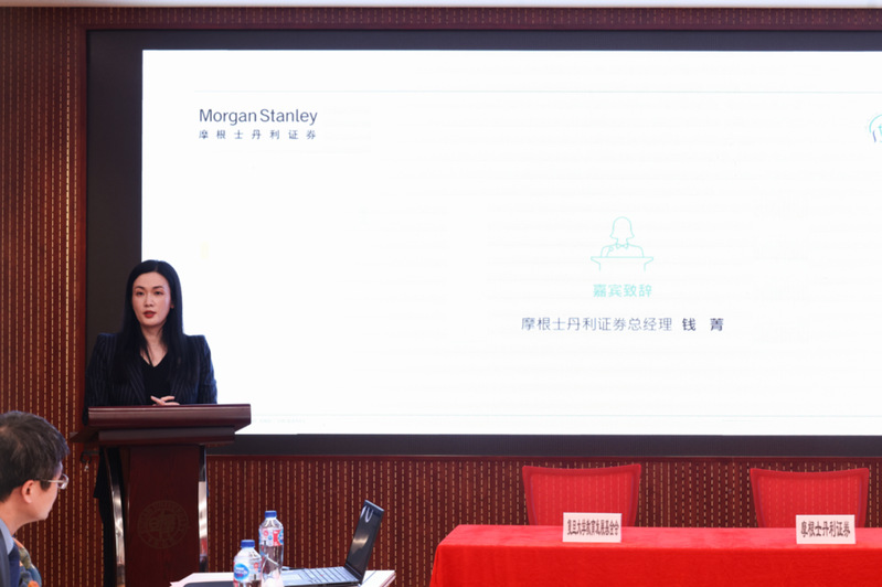 此后,摩根士丹利证券总经理钱菁进行了致辞,回顾了公司通过画册《钟扬的红树梦》对红树林基地产生浓厚兴趣并与生科院结缘的渊源。钱菁表示,作为摩根士丹利集团在中国的证券经营业务实体,摩根士丹利证券一贯秉持集团的核心价值观,在聚焦业务的同时致力于回馈社会,肩负着义不容辞的社会责任。公司高管在了解红树林在上海的引种和培育过程后深受感动,同时也为钟扬教授下决心为上海建立起海岸卫士林而感佩。公司很荣幸以捐款设立基金的方式,为在上海临港的滩涂湿地筑起红树林这片天然屏障、形成固碳汇碳的植物引擎而贡献一份力量,并期待公益基金能够推动与红树植物相关的科普环保教育基地的建设,由此向广大社会公众——特别是儿童及青少年,普及红树类群植物对于吸收碳排放、维护生物多样性、实现绿色可持续发展的重要意义。