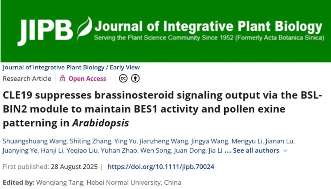 花粉是植物的雄配子体,而有活力的花粉是维持植物繁衍和作物产量的基础。近日,耽美漫画 复杂性状的遗传调控全国重点实验室常芳团队在JIPB在线发表了题为“CLE19 Suppresses Brassinosteroid Signaling Output via the BSL-BIN2 Module to Maintain BES1 Activity and Pollen Exine Patterning in Arabidopsis ”的研究论文(//doi.org/10.1111/jipb.70024)。该研究定义了一个全新的双信号机制,小孢子来源的 CLE19 小肽信号与绒毡层细胞的BR激素信号通过拮抗作用形成“刹车”-“油门”机制,共同保障花粉外壁(exine)的正常发育和生殖稳态。