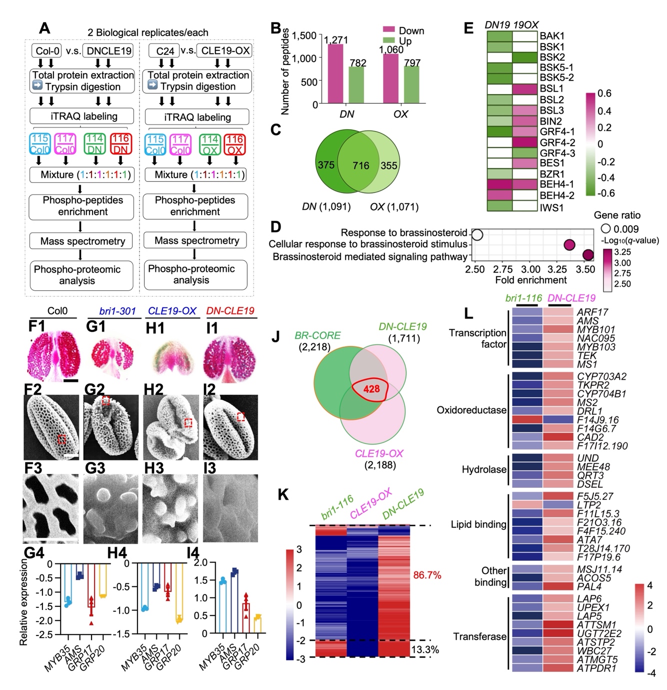 该研究首先通过定量磷酸蛋白组分析,发现 CLE19 会影响多个BR 信号转导组分的磷酸化,包括 BSL 型磷酸酶 BSL1/2/3、GSK3 样激酶 BIN2 和转录因子 BES1。为了阐释两条信号途径的相关性,课题组首先分析了 BR受体 BRI1突变体的表型,并与CLE19 过表达和功能失活型遗传材料的表型进行对比分析。有意思的是, 花粉壁观察和分子表型证据均表明BR 信号传导受阻(bri1 突变体)表现出和CLE19 过表达(CLE19-OX)一致、而和CLE19 功能失活(Dominant Negative-CLE19,DN-CLE19)相反的表型,暗示了暗示了两个信号不仅均参与花粉壁发育过程,且作用方向相反。进一步的转录组分析也支持了这个结论:在 428 个BR和 CLE19 共同的核心下游基因中,86.7% 被两信号反向调控(图 1)。