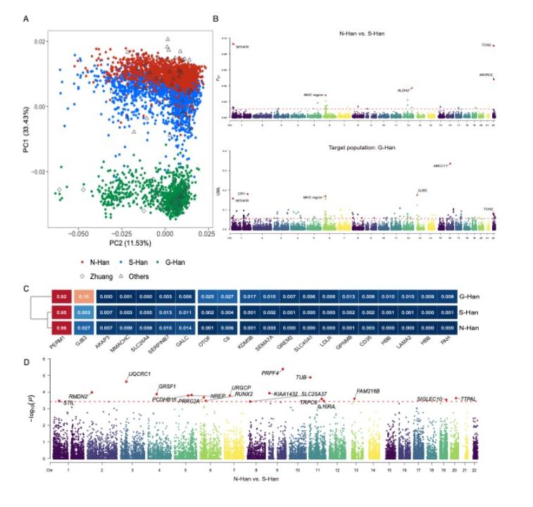 A: 主成分分析揭示的汉族遗传结构;B: 汉族基因组中的差异化适应性演化印记;C: 潜在致病变异在汉族中的等位基因频率分布; D: 南、北方汉族全基因组罕见有害突变负荷的差异分布。