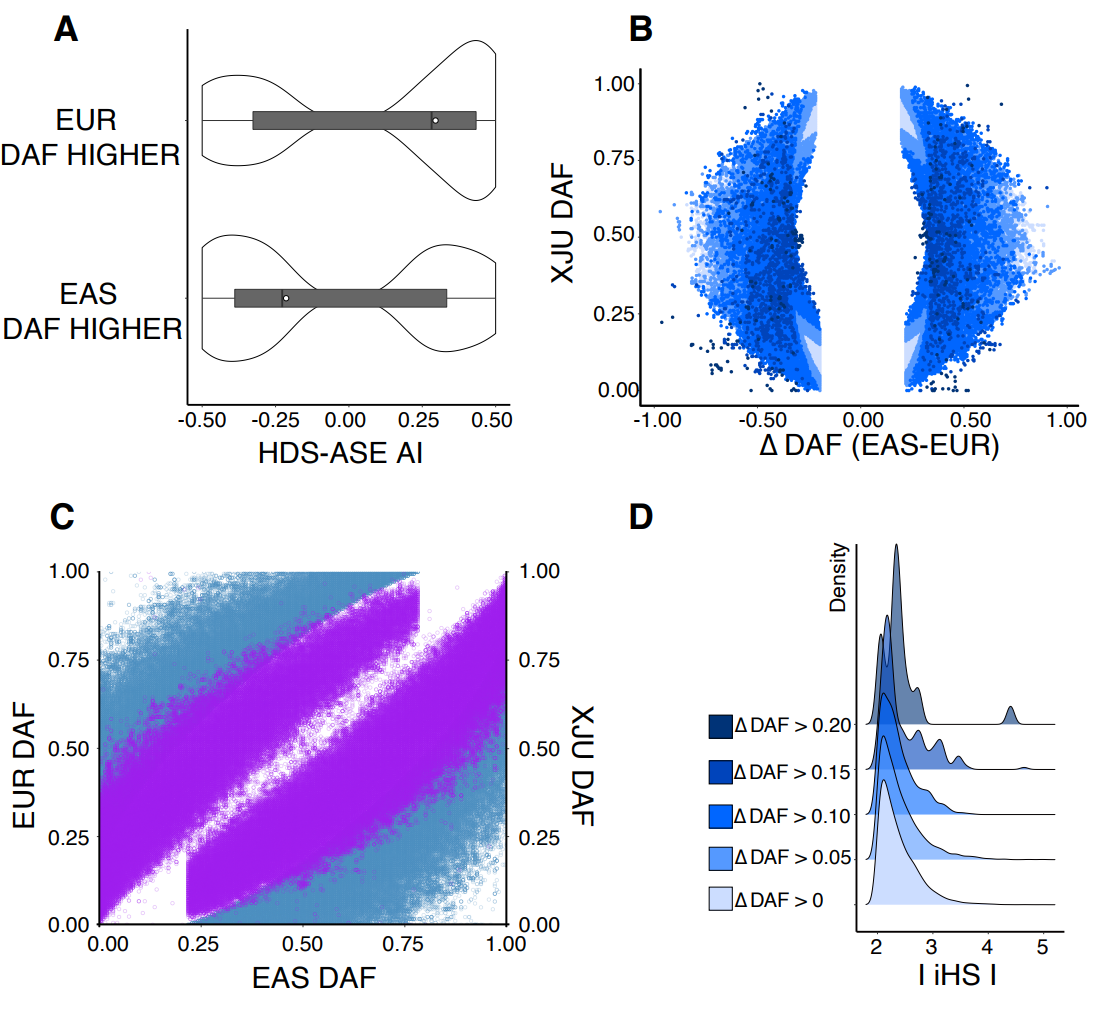 图1. 东西方人群高度分化的基因在维吾尔族的表达图谱。