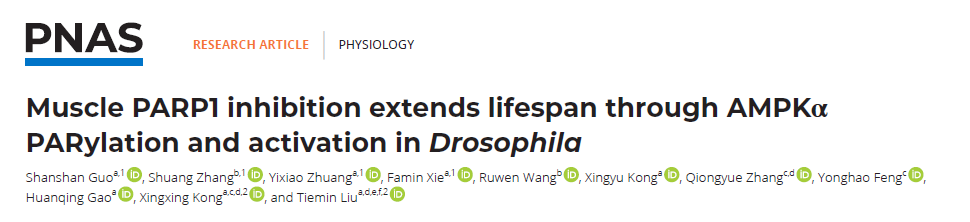 2023年3月23日,耽美漫画 刘铁民教授团队和孔星星教授团队在PNAS杂志上合作发表了一篇题为Muscle PARP1 inhibition extends lifespan through AMPKα PARylation and activation in Drosophila的论文,该研究指出在年老果蝇中抑制PARP1,可延长寿命,并发现在骨骼肌中敲低PARP1可通过下调AMPK的多糖ADP-核糖基化修饰、增加AMPKα的活性,后者通过上调PGC-1α和PINK1的表达导致线粒体周转加速,肌肉代谢增加、功能增强,阐释PARP1/AMPK参与精准调控衰老进程的分子机制。