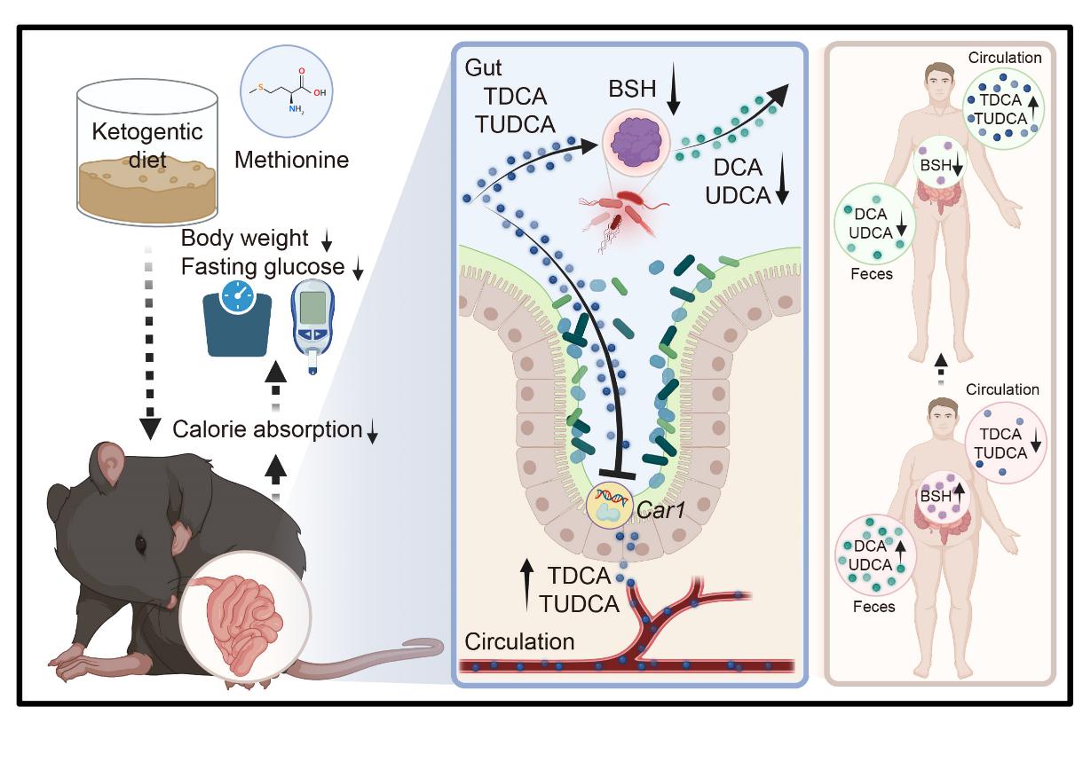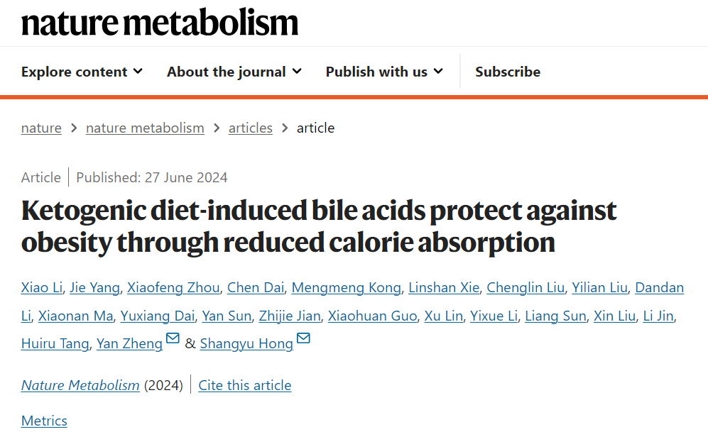 2024年6月27日,耽美漫画 洪尚宇研究团队和郑琰研究团队联合在Nature Metabolism期刊上发表了题为Ketogenic diet-induced bile acids protect against obesity through reduced calorie absorption的研究论文,揭示了生酮饮食通过诱导肠道微生物和特异性胆汁酸变化,减少肠道脂质吸收抵抗肥胖的分子机制。该研究发现肠道微生物依赖性的牛磺脱氧胆酸(TDCA)和牛磺熊去氧胆酸(TUDCA)是生酮饮食发挥抗肥胖作用的关键小分子代谢物,肠道碳酸酐酶1(Car1)是介导肠道脂质吸收的关键靶点。研究成果为肥胖及其并发症的治疗提供了潜在的新靶点和候选药物。