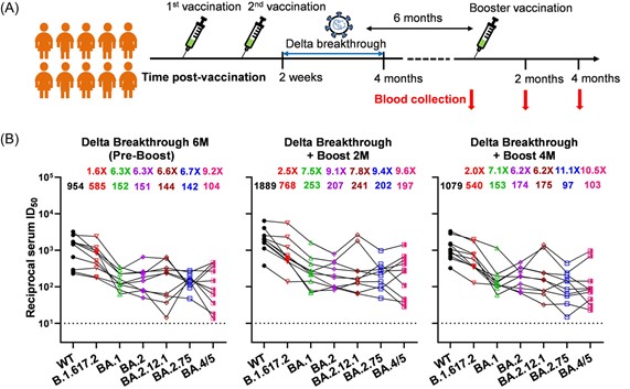 2023年2月1日,王鹏飞青年研究员课题组团队在Journal of Medical Virology发表了题为Limited enhancement of antibody and B-cell responses to prototype booster vaccination following SARS-CoV-2 Delta breakthrough infection的研究论文。作者收集了上一轮经历过Delta的感染者康复后及再接种加强针后的血清,评估了这些个体对不同OmicronBA.1, BA.2, BA.2.12.1, BA.2.75,和BA.4/5变异株的中和活性及B细胞免疫应答。作者发现对既往Delta康复者接种加强针后,相比于接种前,所有变异株中和抗体活性在第二个月时略有提高,在第四个月时没有显著变化。此外,作者还发现针对WT或BA.4/5 的RBD的特异性记忆B细胞的比例在加强针接种前后没有显著差异。总之,该研究发现新冠Delta突破性感染后,中和抗体和B细胞对原型加强疫苗的反应增强有限。该研究对于真实世界中接种策略调整和今后的疫苗设计方向具有重要的参考意义。耽美漫画 王勋、中科院分子细胞卓越中心何星、南京市中医院蒋淑君、华山医院傅掌璠为论文的共同第一作者,耽美漫画 以及上海市重大传染病和生物安全研究院双聘PI王鹏飞、中科院分子细胞卓越中心许琛琦、南京市中医院张彦亮、华山医院艾静文为论文的共同通讯作者。