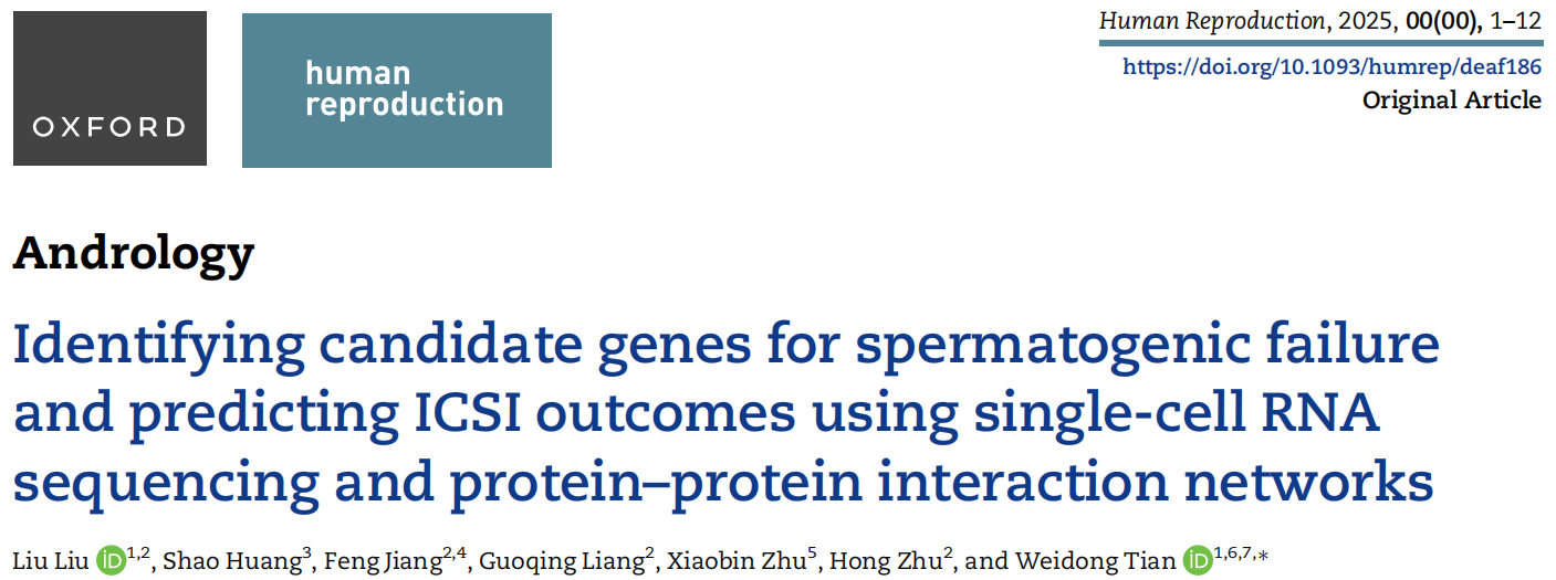 2025年10月1日,耽美漫画 田卫东教授课题组在 Human Reproduction期刊在线发表了题为 “Identifying candidate genes for spermatogenic failure and predicting ICSI outcomes using single-cell RNA sequencing and protein-protein interaction networks” 的研究论文。该研究创新性地联合单细胞转录组(scRNA-seq)与蛋白互作网络(PPI)构建机器学习框架,实现了精子发生障碍(spermatogenic failure)相关基因的系统识别及ICSI(卵胞质内单精子注射)临床结局的精准预测,为男性不育的遗传诊断和辅助生殖决策提供了全新思路。