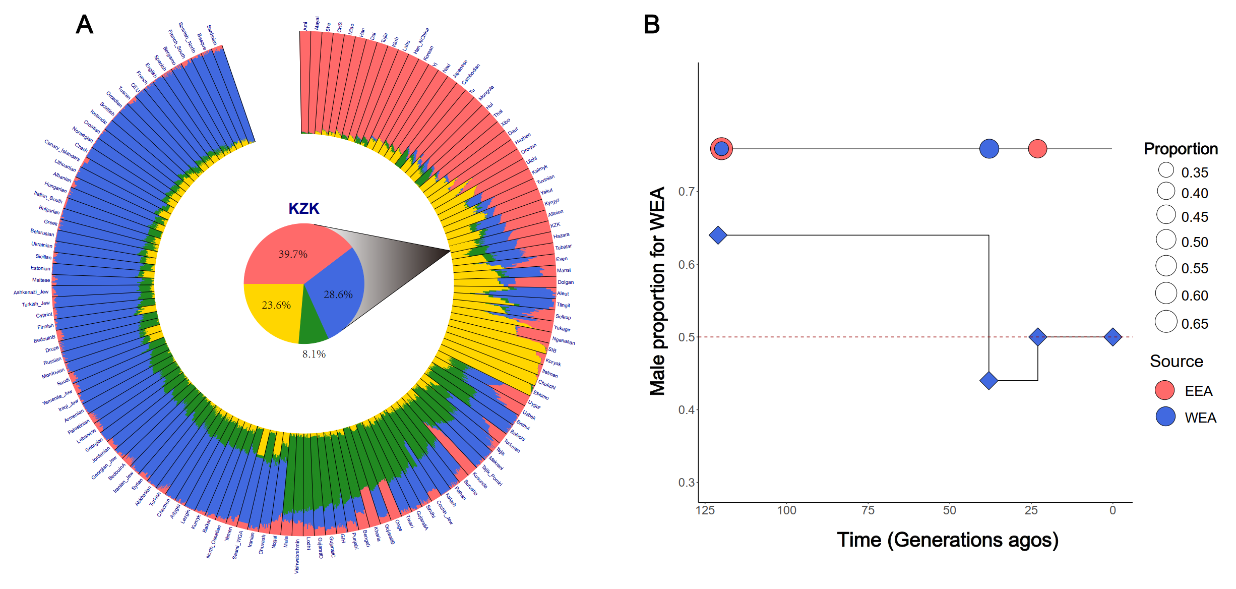 通过对混合历史的建模分析,推断哈萨克族四个主要祖源成分可追溯至两个早期的混合人群。其中,东方祖源可进一步追溯到东亚和西伯利亚的早期人群,西方祖源可追溯至西欧和南亚的早期人群。进一步分析发现,东方祖源与西方祖源经历了三次可识别的族群融合逐步演化为当今的哈萨克族。此外,哈萨克族的基因库形成过程中祖源人群的混合具有性别偏向性,推测可能与历史上的贸易往来与战争有关(图1B)。