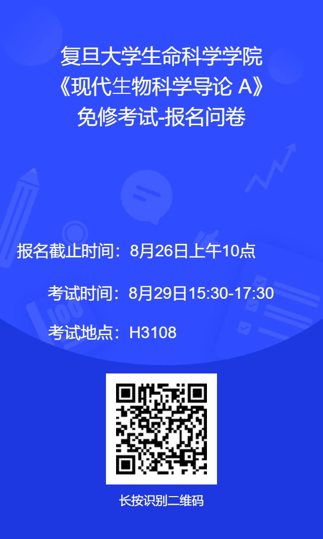 有意参加《现代⽣物科学导论 A》免修资格考试的同学,请在826日上午10点之前扫描如下二维码报名。