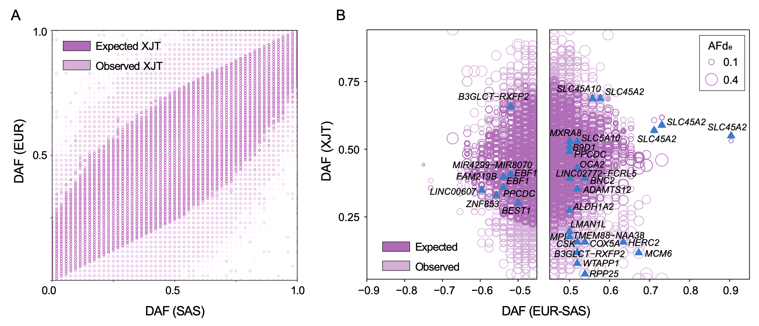 图3. 新疆塔吉克族中观察到的和理论预期的基因变异频谱