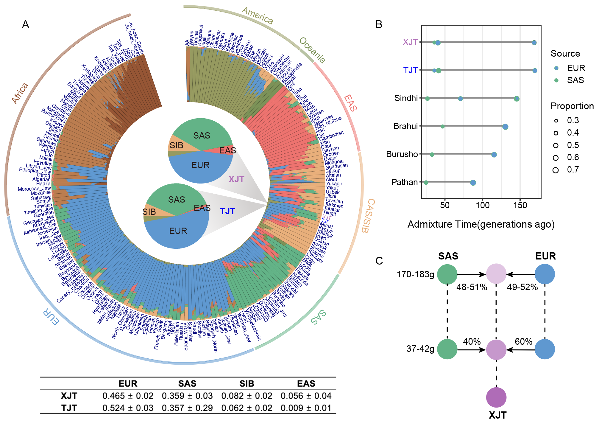 图1. 新疆塔吉克族的祖源构成及混合历史建模