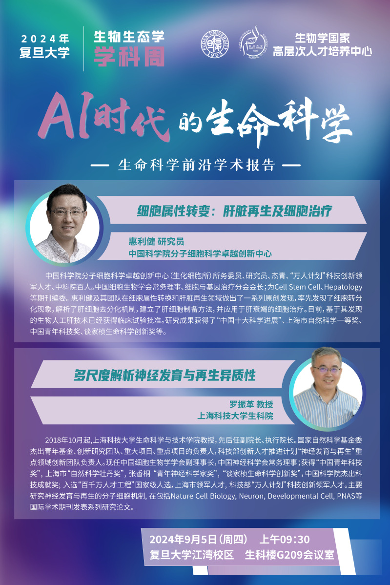 学科周--生命科学前沿学术报告-9月5日(周五)9:30,惠利健(中科院),罗振革(上海科技大学)