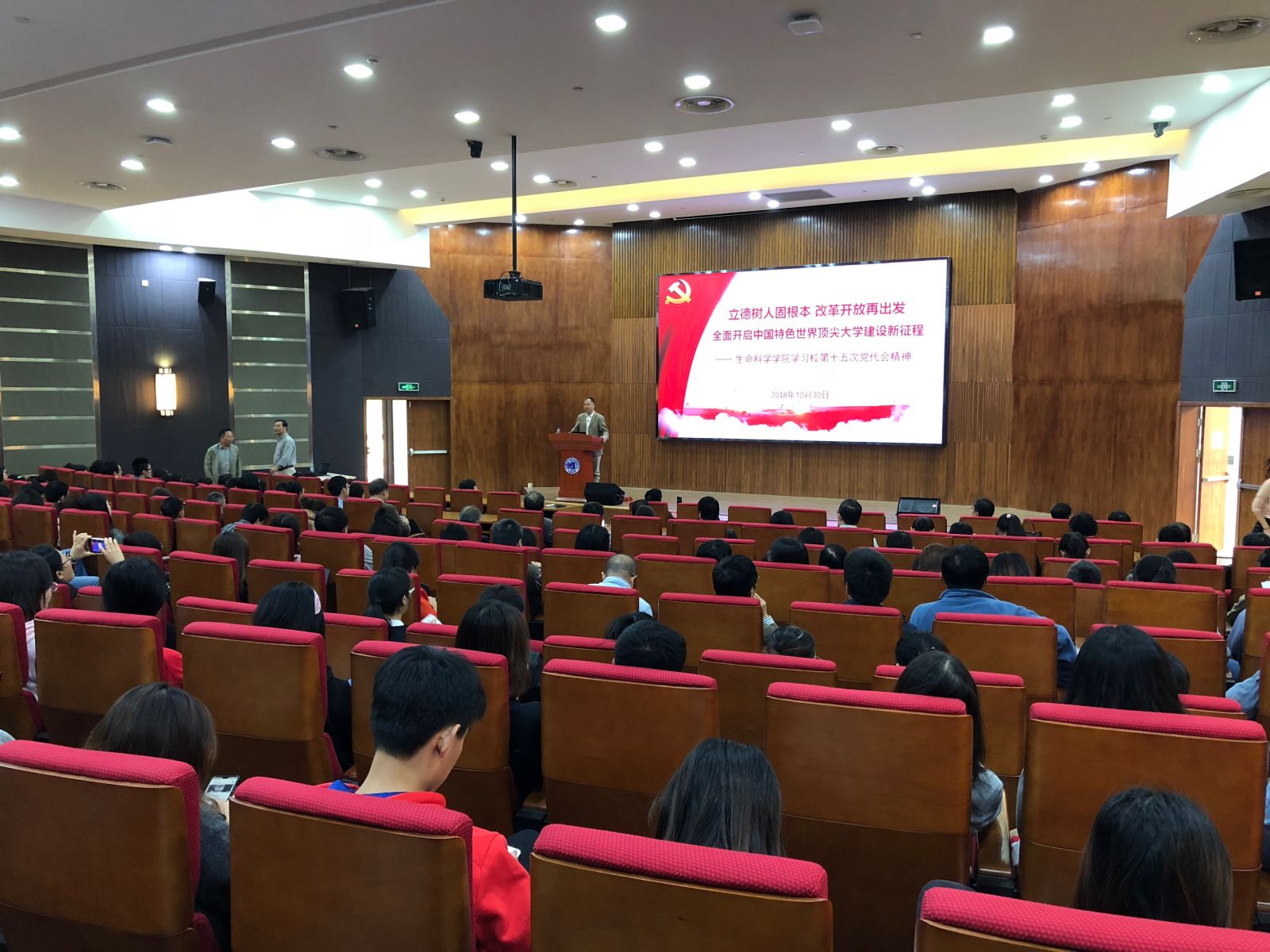 2018年10月30日下午,耽美漫画 在江湾校区生科楼F区报告厅召开全院大会,专题学习贯彻校第十五次党代会精神,会议由陈浩明书记主持。陈浩明向全院师生传达了学校第十五次党代会精神,并就贯彻落实做了工作布置,林鑫华执行院长围绕重点改革任务,就学院教学PI改革方案做了工作动员部署,全院近300名师生参加会议。