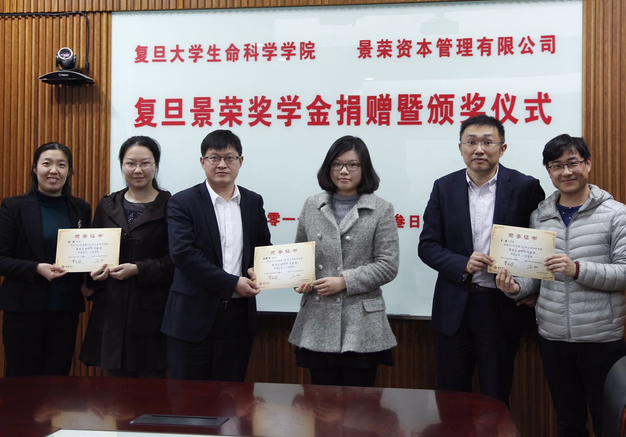 上海景荣 投资控股有限公司副总裁钱庭栀随后宣读2016年度复旦景荣生命科学奖学金获奖学生名单。陆颖丰副处长、陈浩明书记、钱庭栀副总裁、余文博组长分别为“景荣创新奖学金奖”以及“景荣奖学金”的各位获奖学生进行颁奖。颁奖后,与会领导,老师以及同学们一同进行了合影留念。