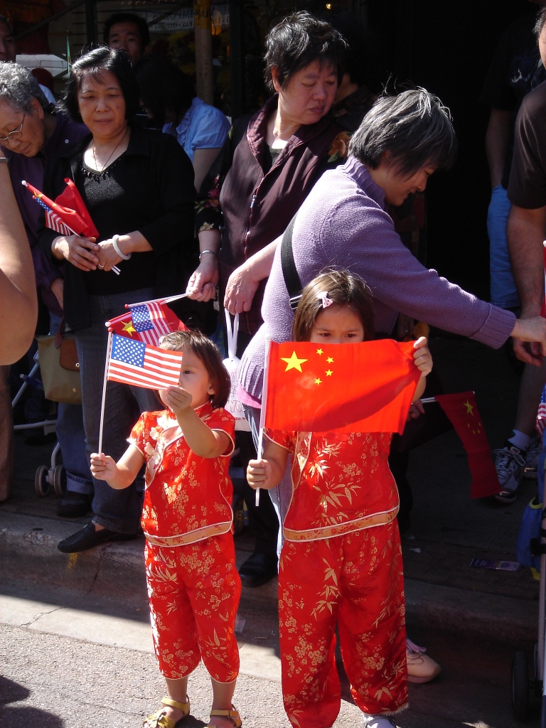 另外观看游行的群众也是里三层外三层,其中一对姐妹手拿中国美国国旗,显得格外醒目。