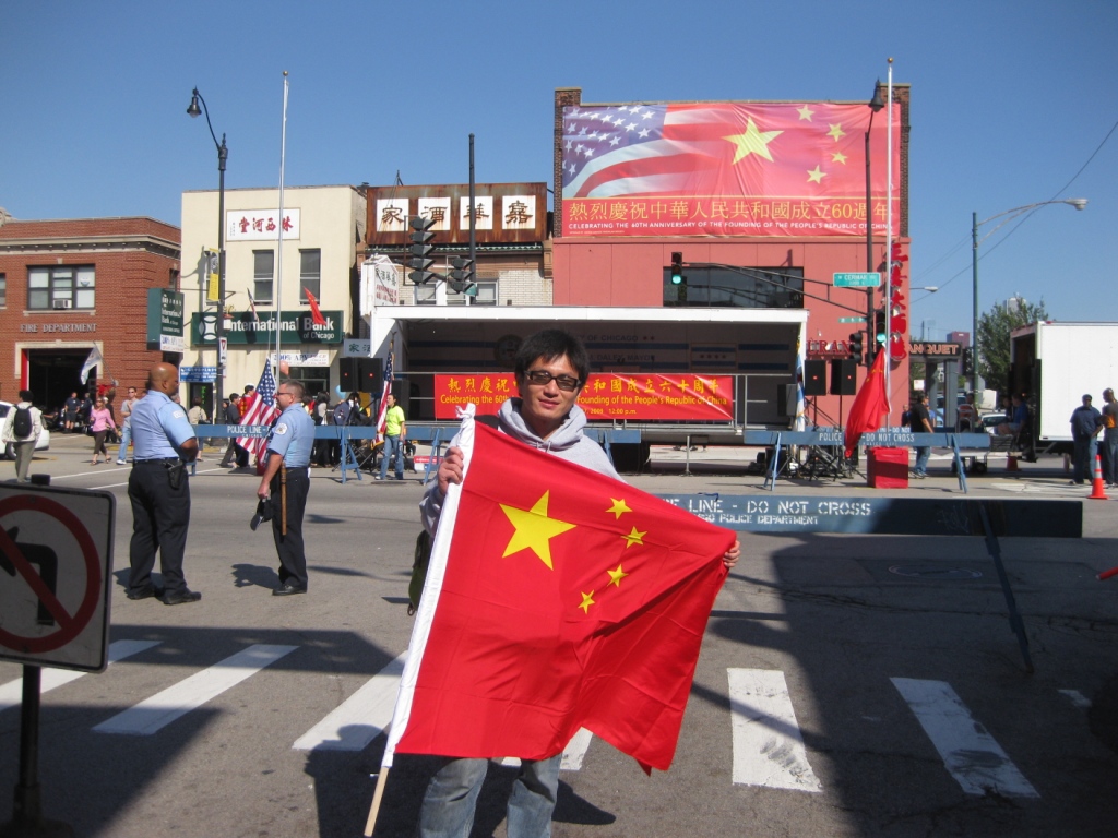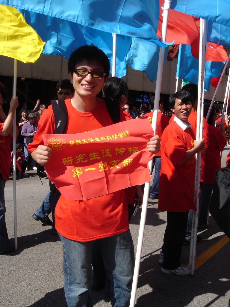 祖国迎来了60岁生日,身为海外学子的我们,也为祖国的生日到来欢欣鼓舞。同时作为原遗传楼第一党支部的支部书记,国家联合培养的博士生,我更能深深感觉到这是向海外华人包括国际友人展示祖国繁荣富强,盛世太平的良好契机,也是体现爱国情怀的一个机会。所以听说芝加哥要举行国庆游行,便早早的报了名,加入 这盛大的队伍中去。