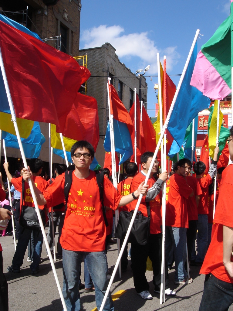 这次游行的方队分别由芝加哥领事馆的花车,广州亚运会的花车,部分当地的高中学校,国内大学的校友会以及一些其他民间的团体组成。我所参加的是由芝加哥大学和西北大学组成的彩旗方阵,大家脸上都洋溢的一份身为中国人的自豪与骄傲。