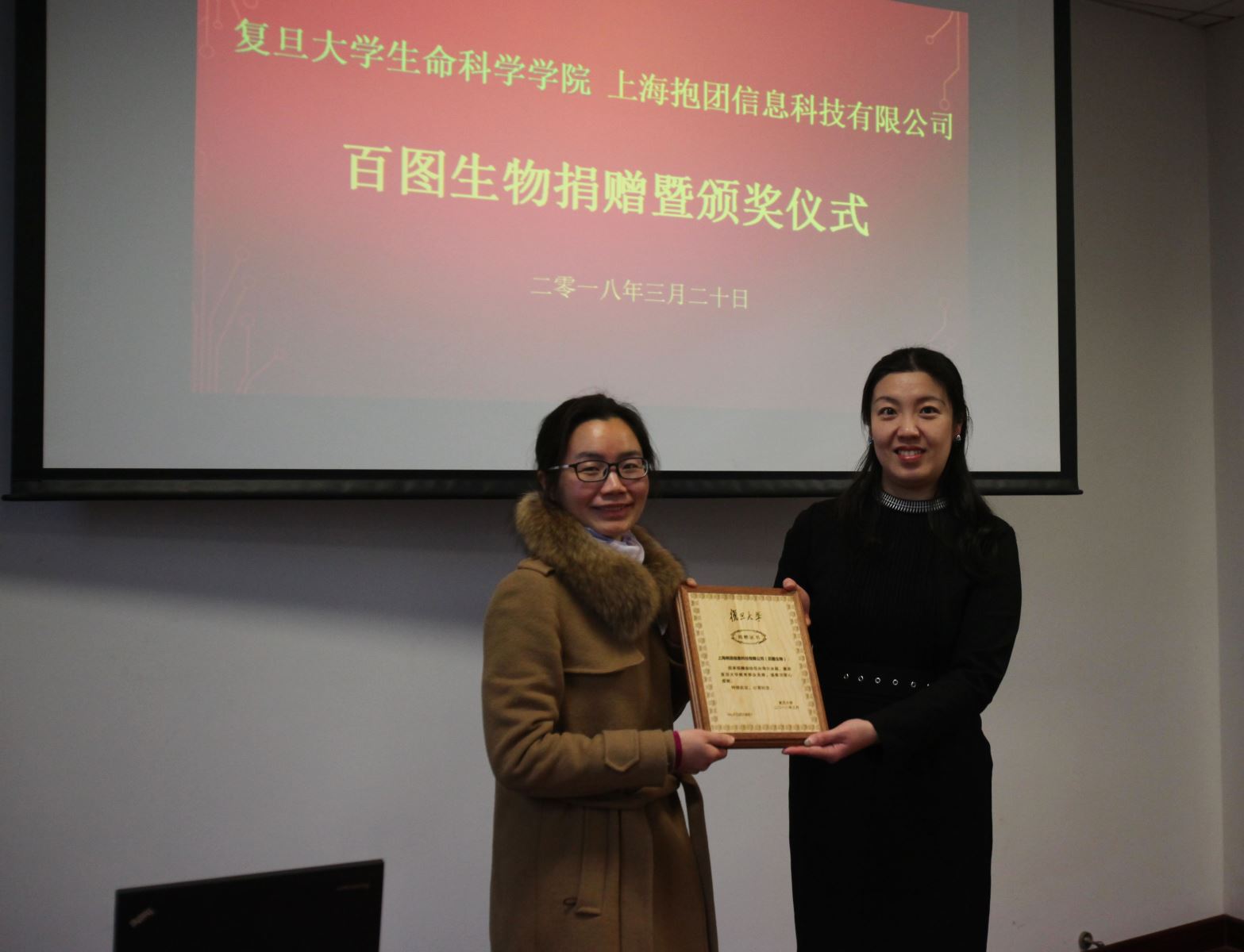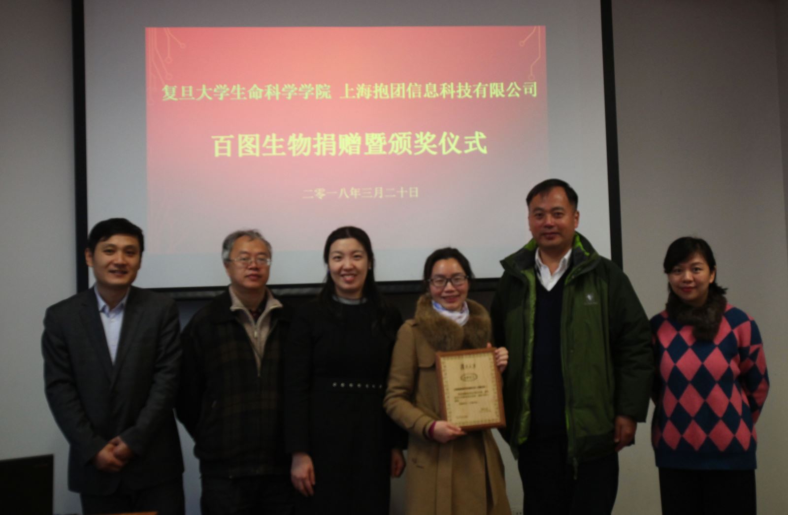 2018年3月20日,百图生物捐赠暨颁奖仪式在耽美漫画 B303会议室举行,耽美漫画 对外联络与发展处副处长陆颖丰、耽美漫画 党委书记陈浩明、上海抱团信息科技有限公司CEO毛萍、耽美漫画 生物技术中心主任钱吉、海尔医疗冰箱上海销售总监杜鹏出席捐赠仪式,会议由耽美漫画 党委书记陈浩明主持。