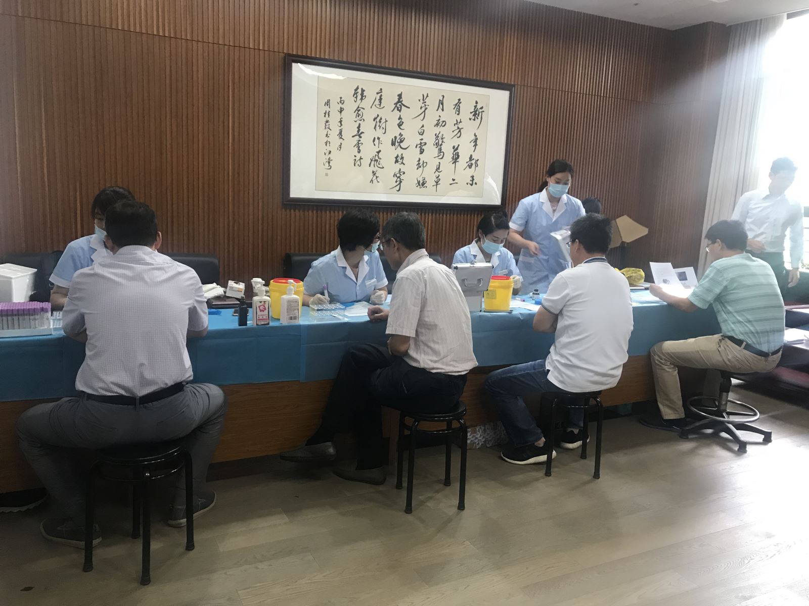 来自鹍远的团队为我院老师和退休老师们,进行现场采血,提供免费的常乐思肠癌无创筛查检测,并接受咨询。