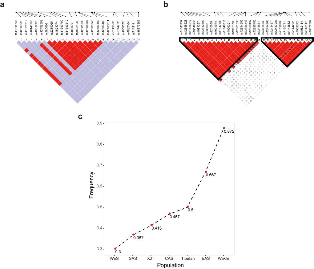 该研究通过计算分析瓦罕人基因组中古人类(丹尼索瓦人、阿尔泰-尼恩德特人和温迪加-尼恩德特人)基因序列信息,发现MAGI2基因区域富集的古人类序列远高于世界其他人群,该发现在单倍型网络分析中得到佐证。有趣的是,MAGI2基因之前被报道在藏猪的高原适应性进化中发挥重要作用,提示趋同演化(convergent evolution)可能并非之前预期那样罕见。另一方面,该研究进一步发现EGLN3基因在瓦罕人群中呈现适应性演化特征,而该基因参与低氧环境中细胞信号转导,此前有报道EGLN3与藏人和埃塞俄比亚高原人群的高原适应性相关。瓦罕人在EGLN3基因区域的12个单核苷酸多态性位点形成一个强连锁不平衡区域,其中最高频单倍型达87.5%,远高于世界其他人群;这也与瓦罕人在EGLN3基因区域存在适应性演化的预期相符(图3)。