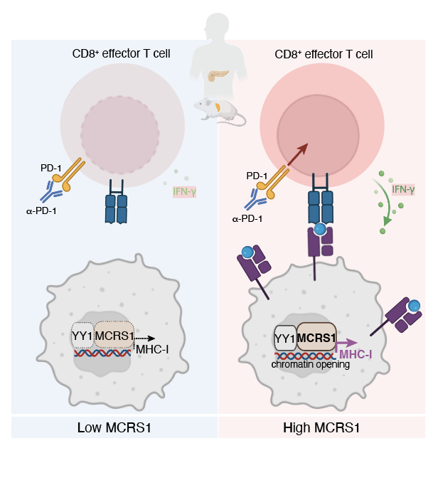 研究团队利用CRISPR激活(CRISPRa)筛选技术,在小鼠胰腺癌细胞(HT)中进行单基因扰动和体外杀伤筛选,并结合TCGA数据库及胰腺癌临床病理样本分析,鉴定出Mcrs1这一能够增强HT细胞对杀伤敏感性的候选基因。通过体内外实验发现,Mcrs1高表达可提高肿瘤细胞中MHC-I分子的表达水平和肿瘤浸润性T淋巴细胞的激活。通过ChIP-Seq、IP-MS及ATAC-Seq分析,发现MCRS1结合于MHC-I基因座,并与另一转录因子YY1相互作用进而协同调控染色质可及性和MHC-I的表达(图1)。同时,Mcrs1高表达也可以增强PD-1阻断对小鼠胰腺癌的治疗效果。临床数据分析表明,MCRS1高表达与胰腺癌患者总生存时间呈正相关。在非小细胞肺癌患者中, MCRS1高表达的患者同样也展现出了更好的PD-1阻断的治疗效果,这表明MCRS1可能在多种实体瘤中都具有相似的免疫增敏效果,具有作为临床中预测PD-1阻断治疗疗效的新指标的潜力。