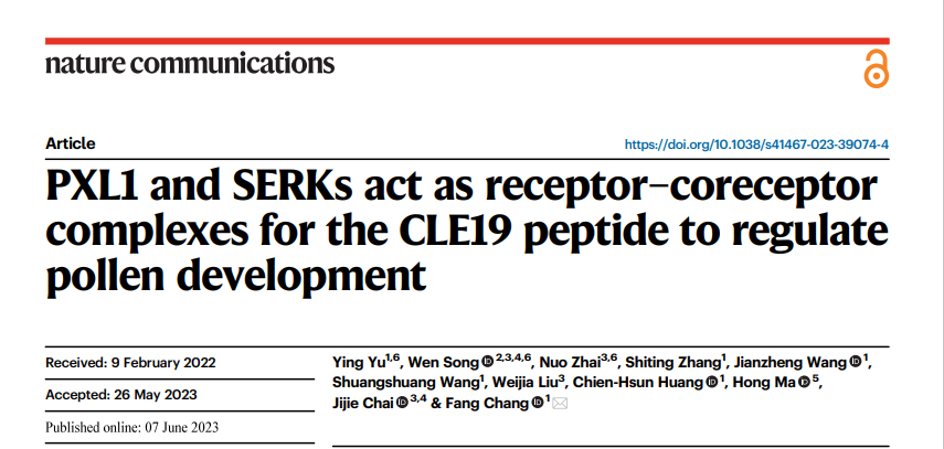 2023年6月7日,耽美漫画 及遗传国重室的常芳团队联合清华大学柴继杰团队在Nature Communications《自然通讯》在线发表了题为“PXL1 and SERKs act as receptor-coreceptor complex for the CLE19 peptide to regulate pollen development”(PXL1和SERKs作为受体-共受体复合物介导CLE19小肽信号而调控花粉发育)的研究论文。该研究以拟南芥花药为模式系统,通过一系列实验证实了PXL1-SERKs是细胞外小肽CLE19的受体-共受体,揭示了该模块介导小孢子-花药壁体细胞间信号交流,进而维持花粉育性的分子机制。