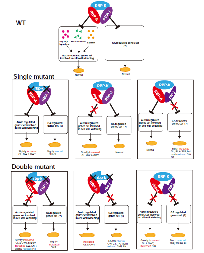 RBP-K作为一种相对非特异性的 RBP 因子,使得 RBP-A 和 RBP-J 正常发挥作用。RBP-J 很可能会影响 GA 通路,导致谷粒和圆锥花序长度显著增加,但谷粒宽度和厚度下降。与此相反,RBP-A 负向调节基因的表达,这些基因很可能参与了控制细胞壁伸长和碳水化合物运输的辅助素调节途径,对水稻谷粒充实过程以及谷粒长度和重量产生了重大影响。该研究揭示了 RBP 介导的转录后调控对复杂性状多样性的重要性。此外,利用 CRISPR/Cas9 技术在特定 RBP 基因上引入各种完全或部分功能缺失的突变,并通过标记辅助选择利用 RBP-A-J-K 复合体元件等位基因组合,可以提高水稻谷粒的产量和品质。