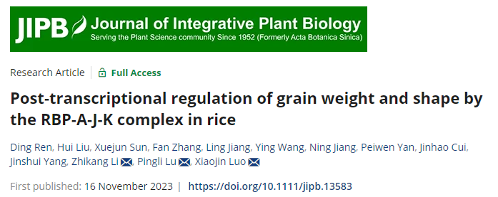 2023年11月16日,耽美漫画 罗小金/陆平利团队联合中国农科院黎志康团队在JIntegr Plant Biol期刊上发表了题为“Post-transcriptional regulation of grain weight and shape by the RBP-A-J-K complex in rice (Oryza sativa L.)”的研究论文。该研究采用图位克隆、功能基因组、转录组以及群体基因组的研究方法,发现 RBP-A、RBP-J和 RBP-K编码的蛋白质形成了一个 RBP-A-J-K 复合物,对水稻产量相关性状起负调控作用。