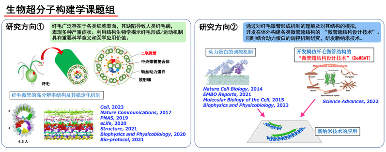 Research Direction1: Structural analysis of ciliary protein complexes. Cilia are tiny hair like structures attached to eukaryotic cell surfaces. Cilia are important for propelling motility of the cells like sperm cells. Cilia also receive signals from outside environment. Thus, defects of ciliary proteins are linked to many human diseases collectively termed as ciliopathy. Cilia have a complex 9+2 architecture and composed of over 600 kinds of proteins. To understand how cilia function and to develop new treatment for ciliopathy, it is crucial to obtain structures of ciliary protein complexes and whole ciliary structure.