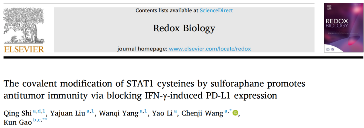 2025年2月17日,耽美漫画 王陈继团队、上海市第一妇婴保健院/同济大学附属妇产科医院高昆团队合作在Redox Biology在线发表了题为 “The covalent modification of STAT1 cysteines by sulforaphane promotes antitumor immunity via blocking IFN-γ-induced PD-L1 expression”的研究论文。该研究揭示了SFN通过共价修饰STAT1蛋白的半胱氨酸残基,阻断IFN-γ诱导的PD-L1表达,从而增强抗肿瘤免疫的分子机制。