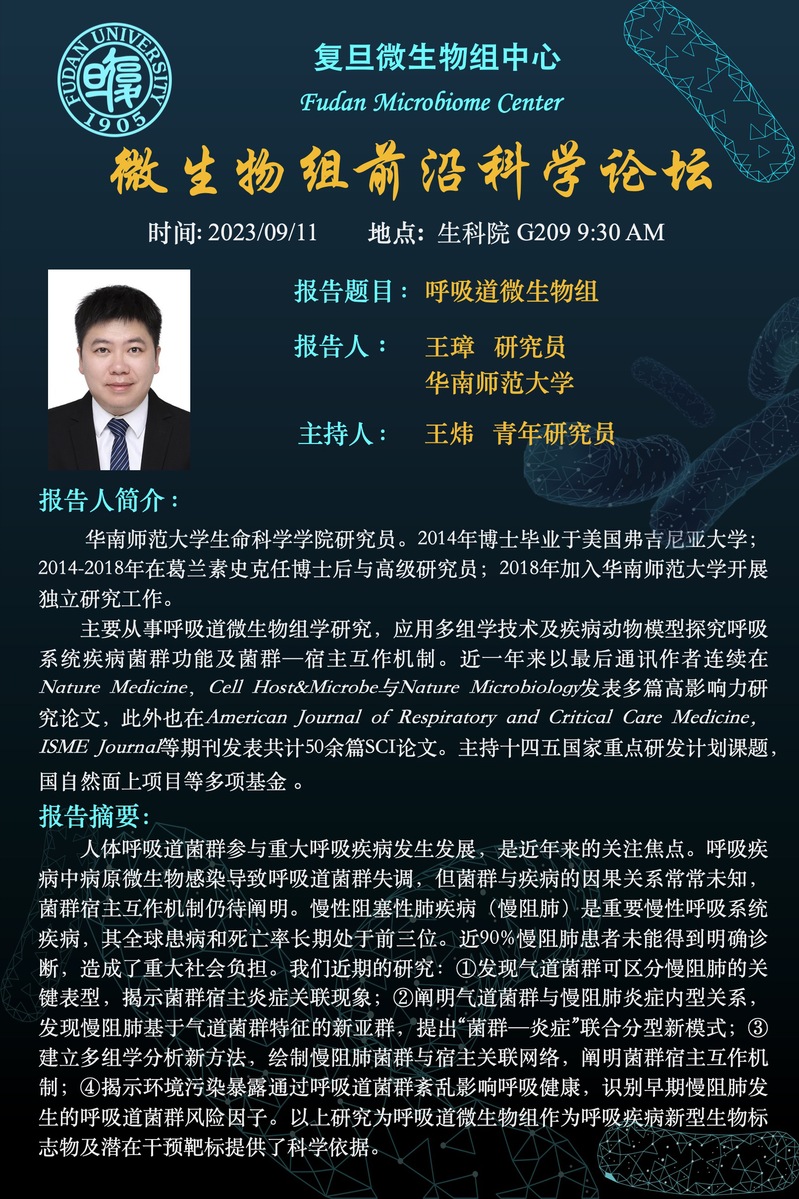 微生物学系特邀报告:2023-09-11(周一)9:30,王璋 研究员(华南师范大学)